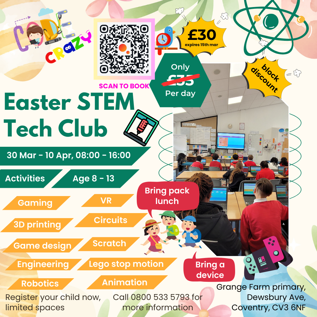 Ignite young minds with our exciting Easter holiday club & dive into a world of discovery, creativity, and fun! Our holiday clubs are perfect for non-sporting curious children eager to explore technology, engineering, animation, VR, 3D printing and game design through hands-on experiments, creative projects, and exciting challenges.