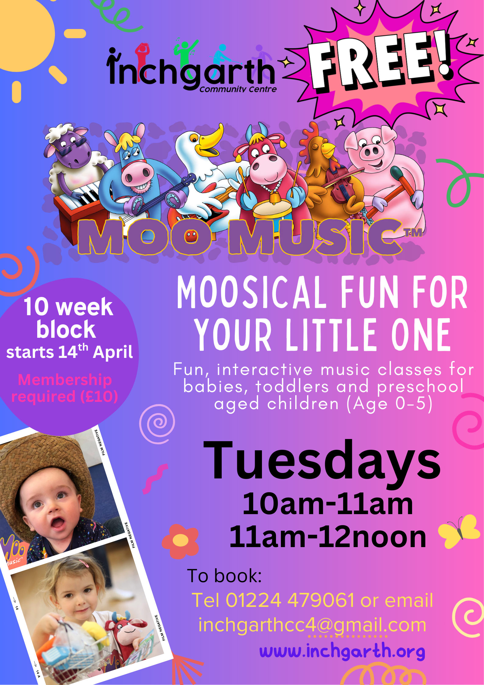 Fun and interactive music and movement class for babies, toddlers and preschool age children. Free class but membership of Inchgarth is required (£10 per year). 10 week block starting 14th April.