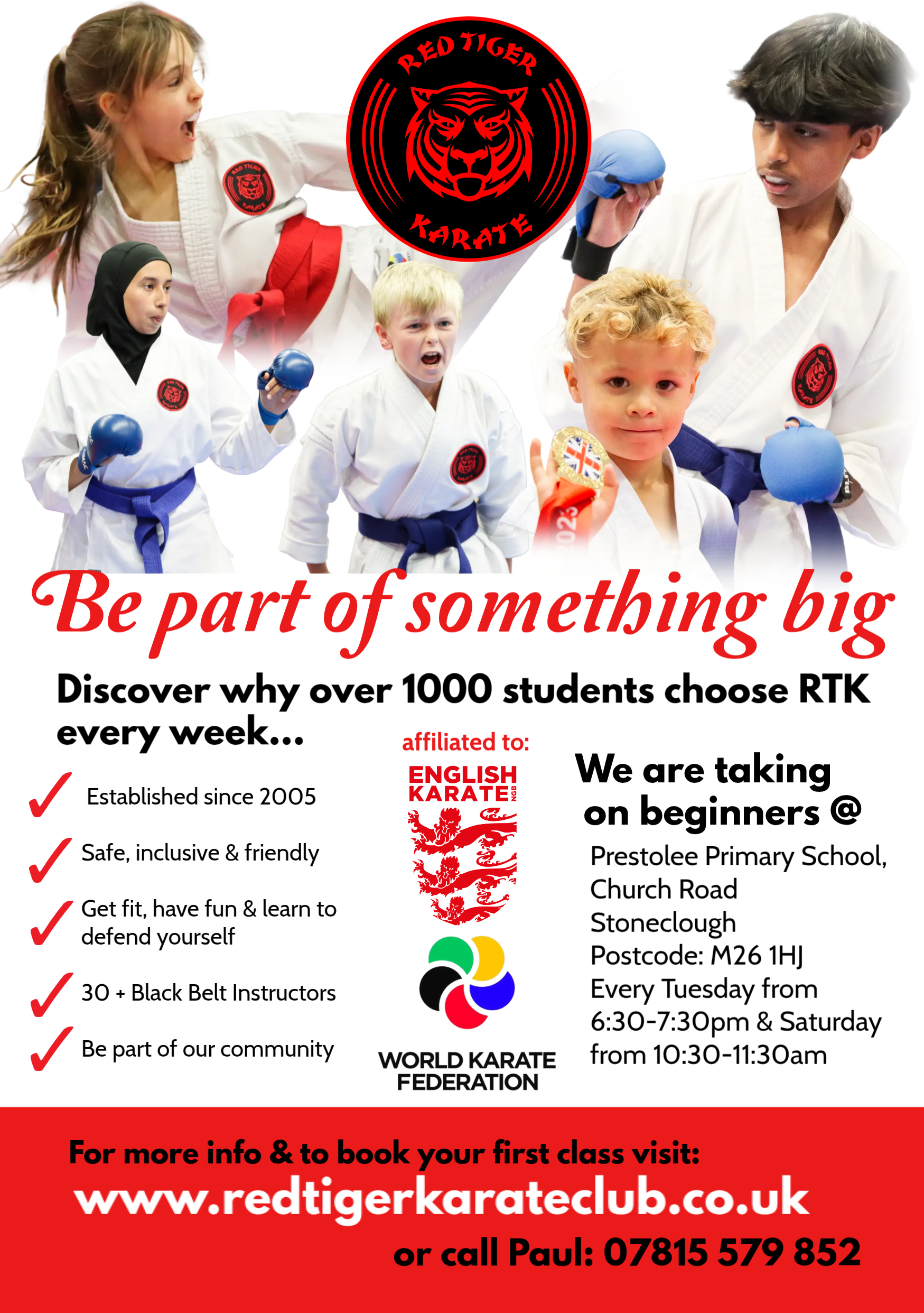 Red Tiger Karate Club provides quality instruction to children from 4 years old all the way to late adulthood. Our classes are based in Greater Manchester, Lancashire and Cheshire and we cater for people of all abilities. We pride ourselves on having a great team of instructors. First and foremost, we are all warm and friendly people. We are Instructor qualified; DBS checked and first aid trained. At Red Tiger Karate, we care about the development and constant improvement of each and every one of our students. We are committed to helping you achieve your goals, whatever they may be.