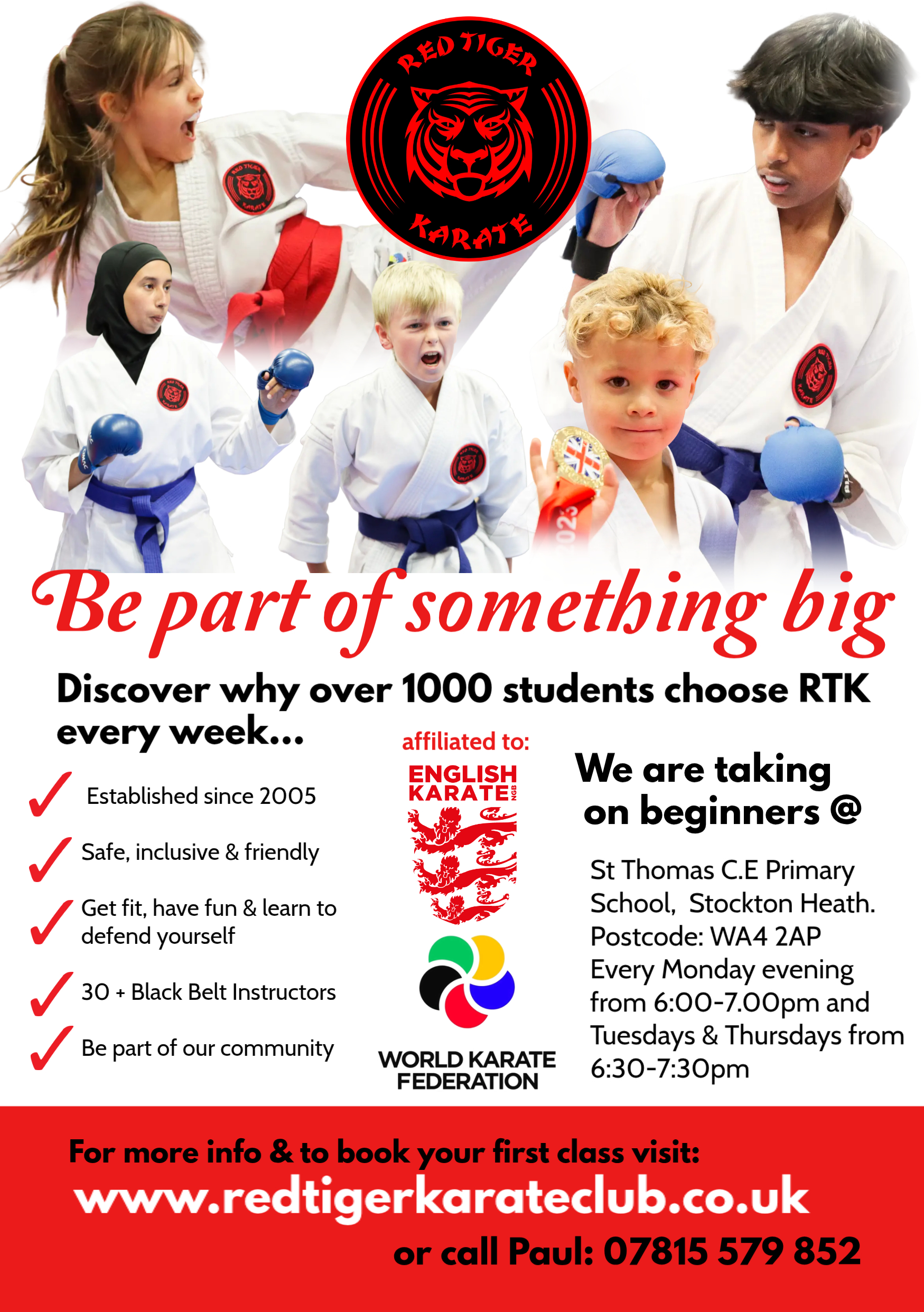 Red Tiger Karate Club provides quality instruction to children from 4 years old all the way to late adulthood. Our classes are based in Greater Manchester, Lancashire and Cheshire and we cater for people of all abilities. We pride ourselves on having a great team of instructors. First and foremost, we are all warm and friendly people. We are Instructor qualified; DBS checked and first aid trained. At Red Tiger Karate, we care about the development and constant improvement of each and every one of our students. We are committed to helping you achieve your goals, whatever they may be.