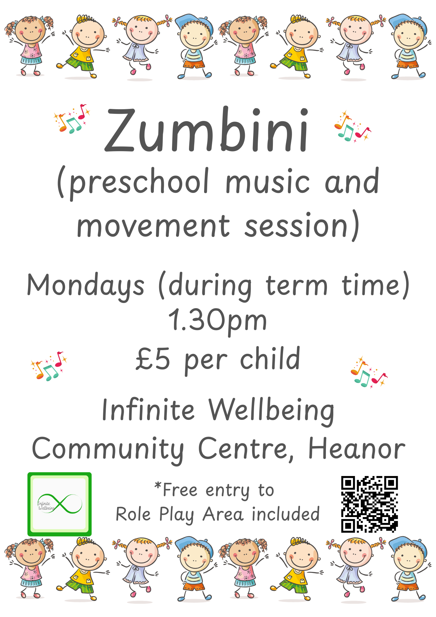 Join us for a fun and energetic Zumbini class every Monday during term time, from 1:30 PM to 2:15 PM, at the Infinite Wellbeing Community Centre!